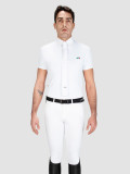 通気性と伸縮性に優れた高機能素材・X-プレミアムを使用した半袖コンペティションシャツ。快適で、動きを妨げないポロシャツタイプ。襟はボタンダウン、ソフトラバーのネクタイ留め付き(ネクタイは別売)。サイドに通気孔とロゴ刺繍入り。ホワイトのみ。イタリア製
