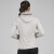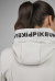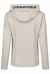 表面はツルっとした手触り、内側は起毛して暖か、風を通さず、吸湿速乾性に優れた高機能テックフリース生地を使用、すっきりした綺麗めシルエットのフード付きジャケット。フードの縁はキラキラ輝くストーンが付いたシリコンロゴラベル、左腕にシリコンロゴエンブレム付き。色:ペールグレー、ブラック。サイズ:38。85%ナイロン、15%ポリウレタン。